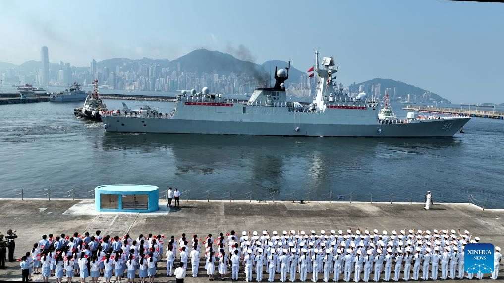 HONG KONG, 7 julio, 2025 (Xinhua) -- La fragata de misiles Yuncheng abandona el muelle de la base naval de la guarnición del Ejército Popular de Liberación (EPL), en Hong Kong, en la isla Stonecutters, en Hong Kong, en el sur de China, el 7 de julio de 2025. Una flota de la Armada del EPL de China, liderada por el portaaviones Shandong, partió de Hong Kong, al sur de China, el lunes por la mañana, culminando una visita de cinco días. El gobierno de la Región Administrativa Especial de Hong Kong (RAEHK) organizó una ceremonia de despedida en la Base Naval de la Isla Stonecutters. (Xinhua/Jia Xiaopeng)
