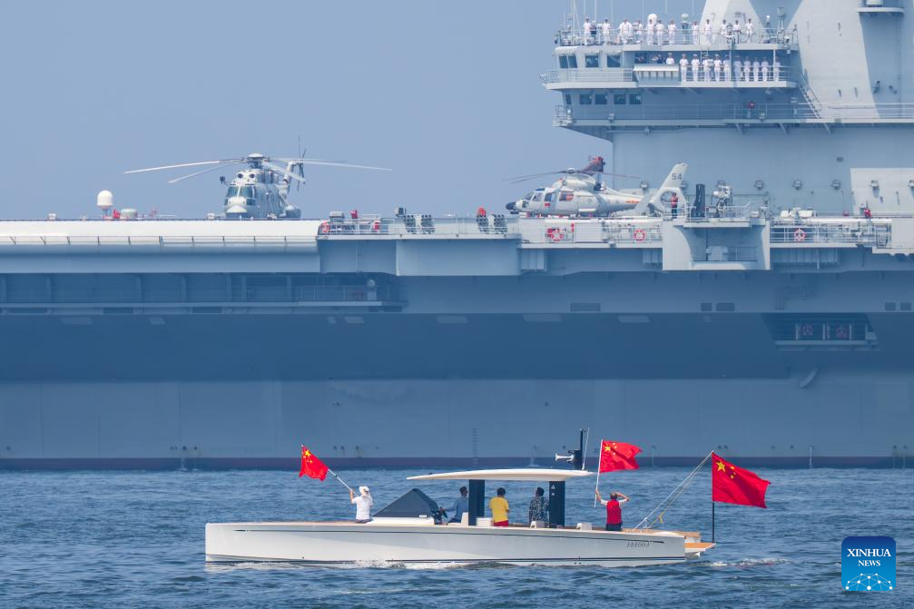 HONG KONG, 7 julio, 2025 (Xinhua) -- Ciudadanos a bordo de un ferry observan el zarpe del portaaviones Shandong, en Hong Kong, en el sur de China, el 7 de julio de 2025. Una flota de la Armada del Ejército Popular de Liberación (EPL) de China, liderada por el portaaviones Shandong, partió de Hong Kong, al sur de China, el lunes por la mañana, culminando una visita de cinco días. El gobierno de la Región Administrativa Especial de Hong Kong (RAEHK) organizó una ceremonia de despedida en la Base Naval de la Isla Stonecutters. (Xinhua/Zhu Wei)