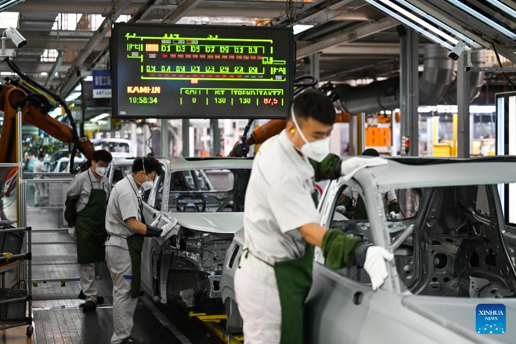 TIANJIN, 7 julio, 2025 (Xinhua) -- Empleados revisan productos en proceso dentro de un taller de soldadura en la base del norte de China de FAW-Volkswagen, en Tianjin, en el norte de China, el 7 de julio de 2025. En los últimos años, Tianjin se ha comprometido a construir fábricas inteligentes y acelerar la integración profunda de la economía digital con la economía real. (Xinhua/Zhao Zishuo)