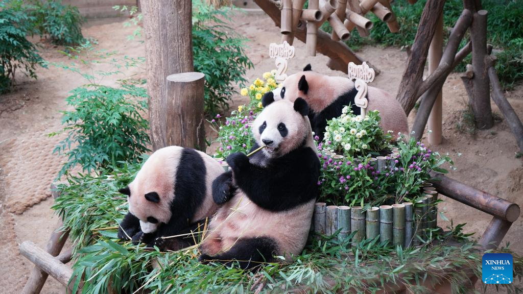 YONGIN, 7 julio, 2025 (Xinhua) -- Las pandas gigantes gemelas Rui Bao y Hui Bao son vistas durante la celebración de su segundo cumpleaños con su madre Ai Bao (d-frente) en Everland Resort, en Yongin, República de Corea, el 7 de julio de 2025. Las gemelas panda gigante Rui Bao y Hui Bao celebraron el lunes aquí su segundo cumpleaños. Ai Bao dio a luz a las gemelas el 7 de julio de 2023. (Xinhua/Sun Yiran)