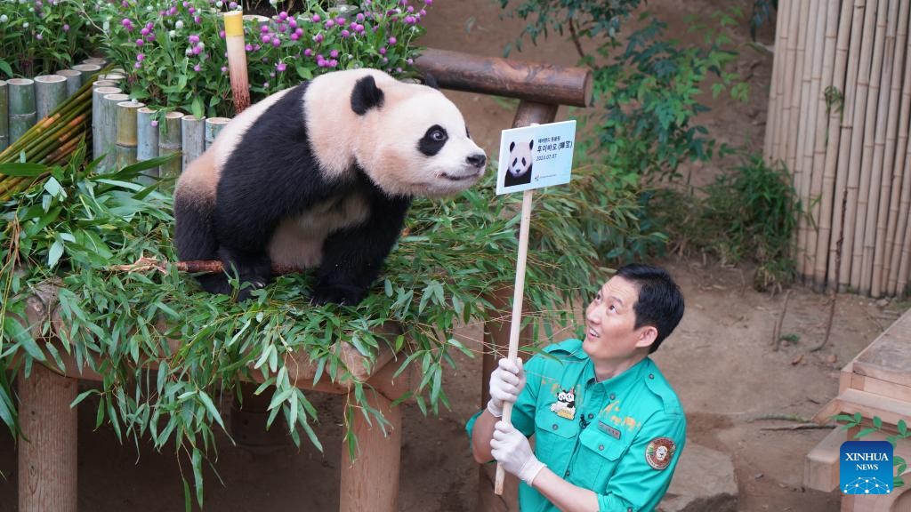 YONGIN, 7 julio, 2025 (Xinhua) -- Hui Bao, una de las pandas gigantes gemelas interactúa con su cuidador durante una celebración por el segundo cumpleaños de los gemelos, en Everland Resort, en Yongin, República de Corea, el 7 de julio de 2025. Las pandas gigantes gemelas Rui Bao y Hui Bao celebraron el lunes aquí su segundo cumpleaños. Ai Bao dio a luz a las gemelas el 7 de julio de 2023. (Xinhua/Sun Yiran)