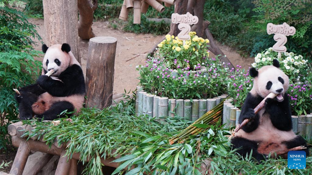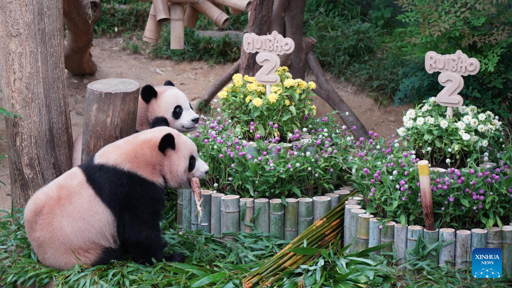 YONGIN, 7 julio, 2025 (Xinhua) -- Las pandas gigantes gemelas Rui Bao y Hui Bao son vistas durante la celebración de su segundo cumpleaños en Everland Resort, en Yongin, República de Corea, el 7 de julio de 2025. Las pandas gigantes gemelas Rui Bao y Hui Bao celebraron el lunes aquí su segundo cumpleaños. Ai Bao dio a luz a las gemelas el 7 de julio de 2023. (Xinhua/Sun Yiran)