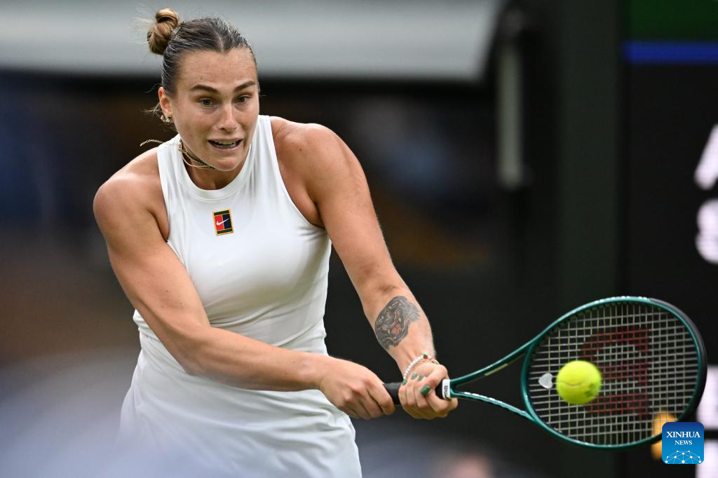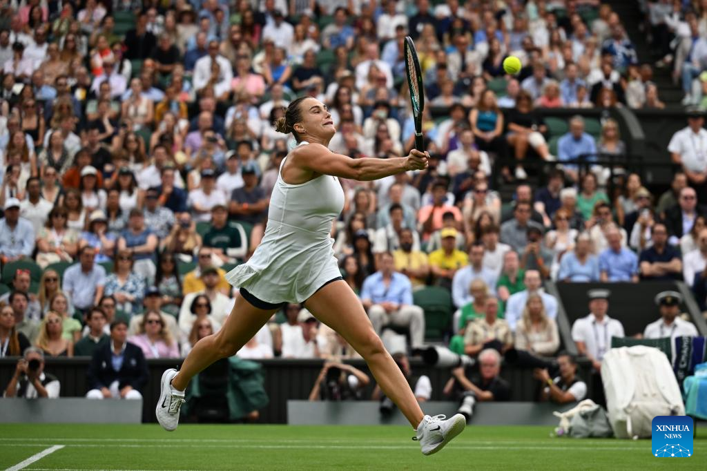 LONDRES, 7 julio, 2025 (Xinhua) -- Imagen del 6 de julio de 2025 de Aryna Sabalenka devolviendo la pelota durante el partido de cuarta ronda de individuales femeninos entre Aryna Sabalenka de Bielorrusia y Elise Mertens de Bélgica en el Campeonato de Tenis de Wimbledon, en Londres, Reino Unido. (Xinhua/Zhao Dingzhe)