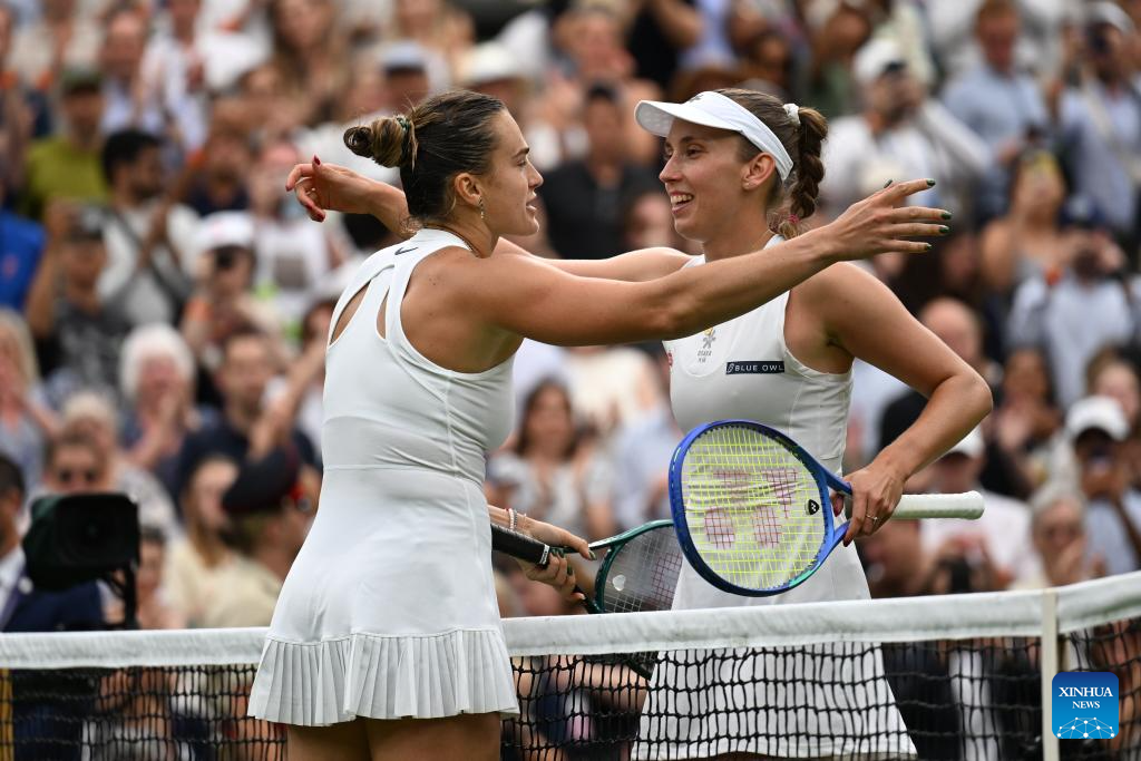LONDRES, 7 julio, 2025 (Xinhua) -- Imagen del 6 de julio de 2025 de Aryna Sabalenka (i) saludando a Elise Mertens al termino del partido de cuarta ronda de individuales femeninos entre Aryna Sabalenka de Bielorrusia y Elise Mertens de Bélgica en el Campeonato de Tenis de Wimbledon, en Londres, Reino Unido. (Xinhua/Zhao Dingzhe)