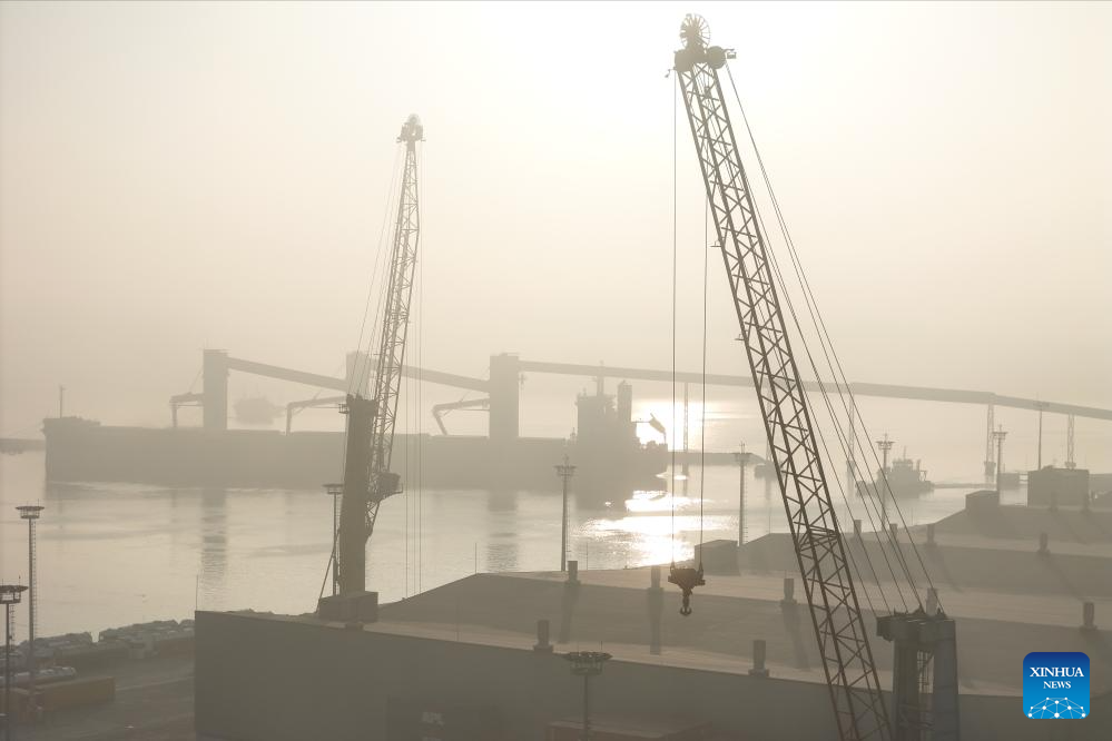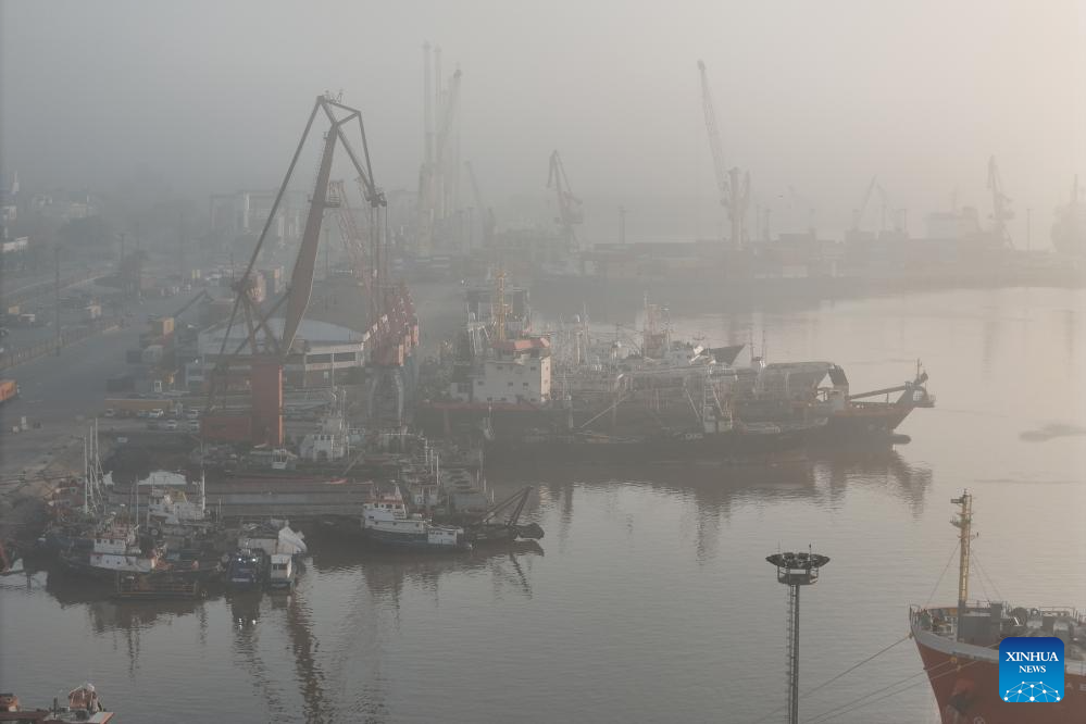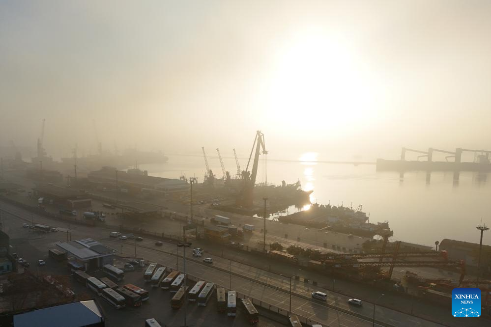 MONTEVIDEO, 8 julio, 2025 (Xinhua) -- Imagen tomada con un dron el 8 de julio de 2025 de niebla cubriendo el puerto de Montevideo, en Montevideo, capital de Uruguay. (Xinhua/Nicolás Celaya)