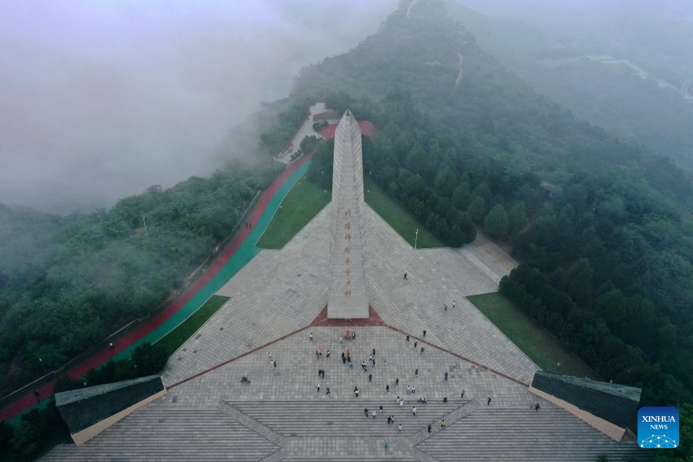 YANGQUAN, 8 julio, 2025 (Xinhua) -- Vista aérea tomada con dron el 8 de julio de 2025 de turistas visitando un monumento a la Ofensiva de los Cien Regimientos, en Yangquan, en la provincia de Shanxi, en el norte de China. La Ofensiva de los Cien Regimientos tuvo lugar en el norte de China desde agosto de 1940 hasta enero de 1941 durante la Guerra de Resistencia del Pueblo Chino contra la Agresión Japonesa. (Xinhua/Zhan Yan)