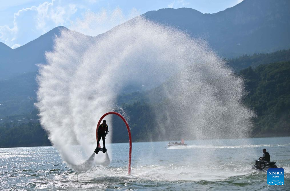 ENSHI, 8 julio, 2025 (Xinhua) -- Imagen del 7 de julio de 2025 de un empleado del centro de deportes acuáticos realizando un espectáculo de "Volador Acuático", en el distrito de Jianshi, en la prefectura autónoma tujia y miao de Enshi, en la provincia de Hubei, en el centro de China. Enshi es un conocido destino turístico de verano en el centro de China. (Xinhua/Song Wen)