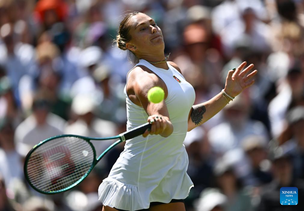 LONDRES, 8 julio, 2025 (Xinhua) -- Aryna Sabalenka devuelve la pelota durante el partido de cuartos de final de individuales femeninos entre Aryna Sabalenka, de Bielorrusia, y Laura Siegemund, de Alemania, en el Campeonato de Tenis de Wimbledon, en Londres, Reino Unido, el 8 de julio de 2025. (Xinhua/Li Ying)