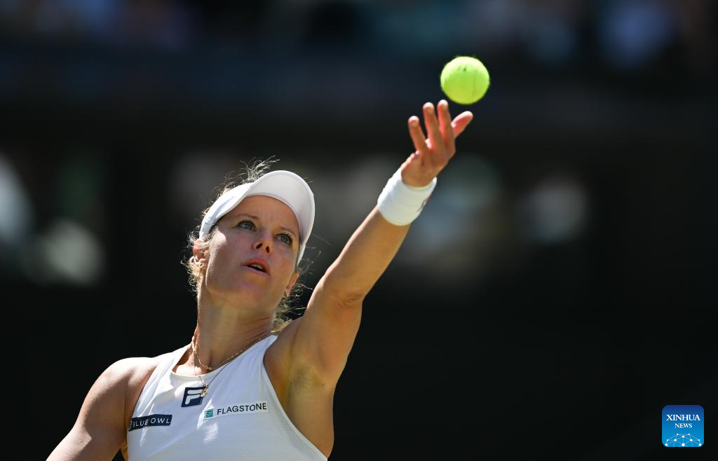 LONDRES, 8 julio, 2025 (Xinhua) -- Laura Siegemund sirve la pelota durante el partido de cuartos de final de individuales femeninos entre Aryna Sabalenka, de Bielorrusia, y Laura Siegemund, de Alemania, en el Campeonato de Tenis de Wimbledon, en Londres, Reino Unido, el 8 de julio de 2025. (Xinhua/Li Ying)
