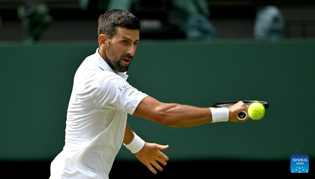 LONDRES, 8 julio, 2025 (Xinhua) -- Imagen del 7 de julio de 2025 de Novak Djokovic devolviendo la pelota durante el partido de octavos de final de individuales masculinos entre Novak Djokovic, de Serbia, y Alex De Minaur, de Australia, en el Campeonato de Tenis de Wimbledon, en Londres, Reino Unido. (Xinhua/Li Ying)