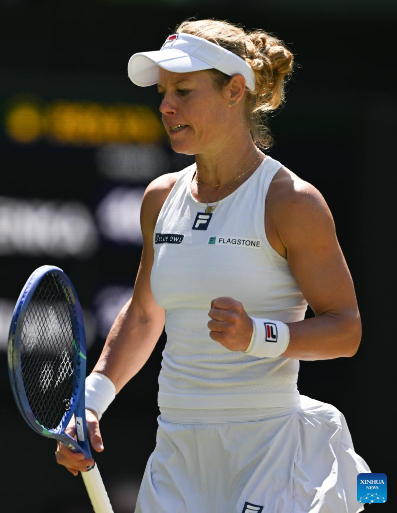 LONDRES, 8 julio, 2025 (Xinhua) -- Laura Siegemund reacciona durante el partido de cuartos de final de individuales femeninos entre Aryna Sabalenka, de Bielorrusia, y Laura Siegemund, de Alemania, en el Campeonato de Tenis de Wimbledon, en Londres, Reino Unido, el 8 de julio de 2025. (Xinhua/Li Ying)