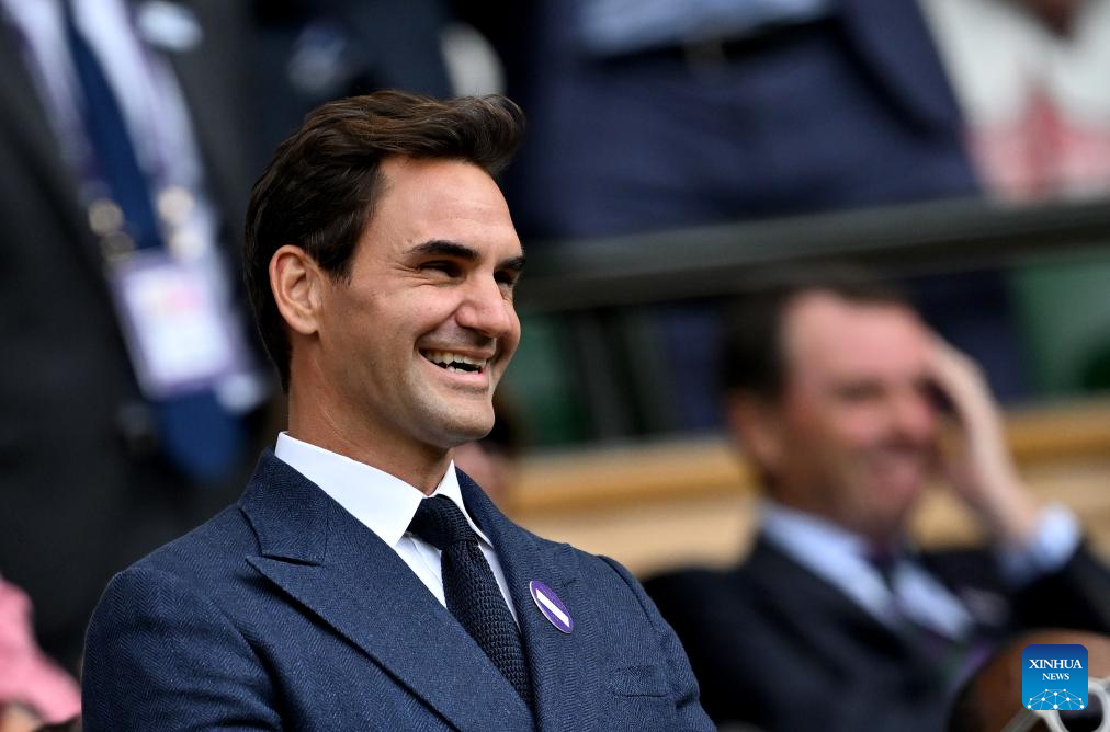 LONDRES, 8 julio, 2025 (Xinhua) -- Imagen del 7 de julio de 2025 de Roger Federer sonriendo al término del partido de octavos de final de individuales masculinos entre Novak Djokovic, de Serbia, y Alex De Minaur, de Australia, en el Campeonato de Tenis de Wimbledon, en Londres, Reino Unido. (Xinhua/Li Ying)