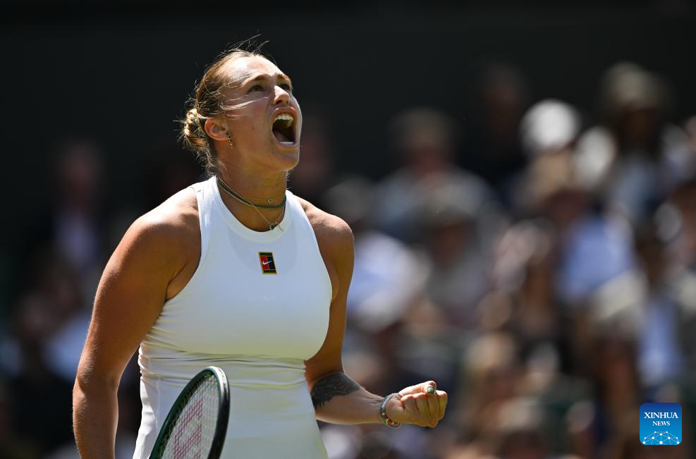 LONDRES, 8 julio, 2025 (Xinhua) -- Aryna Sabalenka festeja un punto durante el partido de cuartos de final de individuales femeninos entre Aryna Sabalenka, de Bielorrusia, y Laura Siegemund, de Alemania, en el Campeonato de Tenis de Wimbledon, en Londres, Reino Unido, el 8 de julio de 2025. (Xinhua/Li Ying)