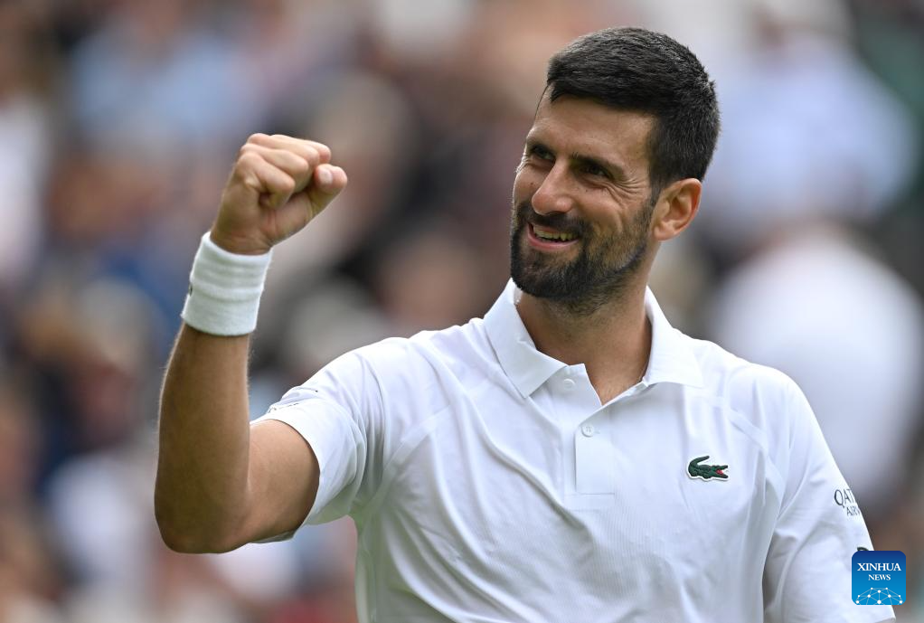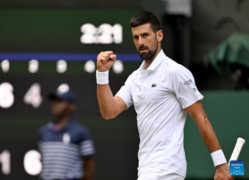LONDRES, 8 julio, 2025 (Xinhua) -- Imagen del 7 de julio de 2025 de Novak Djokovic festejando al término del partido de octavos de final de individuales masculinos entre Novak Djokovic, de Serbia, y Alex De Minaur, de Australia, en el Campeonato de Tenis de Wimbledon, en Londres, Reino Unido. (Xinhua/Li Ying)