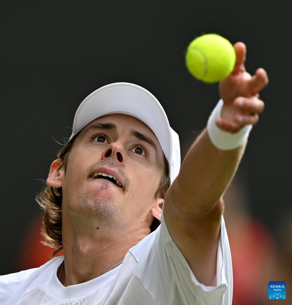 LONDRES, 8 julio, 2025 (Xinhua) -- Imagen del 7 de julio de 2025 de Alex De Minaur sirviendo la pelota durante el partido de octavos de final de individuales masculinos entre Novak Djokovic, de Serbia, y Alex De Minaur, de Australia, en el Campeonato de Tenis de Wimbledon, en Londres, Reino Unido. (Xinhua/Li Ying)