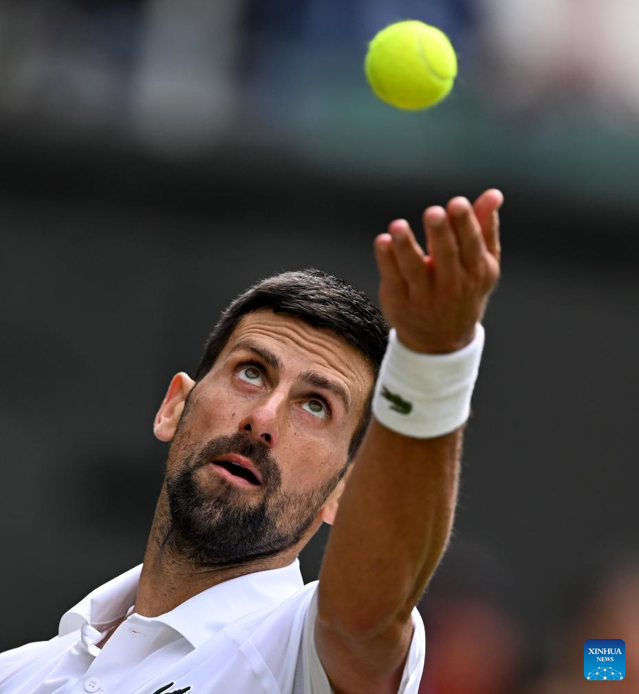 LONDRES, 8 julio, 2025 (Xinhua) -- Imagen del 7 de julio de 2025 de Novak Djokovic sirviendo la pelota durante el partido de octavos de final de individuales masculinos entre Novak Djokovic, de Serbia, y Alex De Minaur, de Australia, en el Campeonato de Tenis de Wimbledon, en Londres, Reino Unido. (Xinhua/Li Ying)