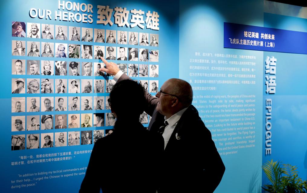 SHANGHAI, 8 julio, 2025 (Xinhua) -- Visitantes deliberan mientras observan los objetos en la Exposición Fotográfica de los Tigres Voladores, en Shanghai, en el este de China, el 8 de julio de 2025. Bajo el lema "Recordando a los héroes y creando el futuro juntos", la exposición se inauguró aquí el martes, mostrando cientos de fotografías valiosas, así como otros artículos de importancia histórica aportados por los veteranos de los Tigres Voladores. (Xinhua/Fang Zhe)