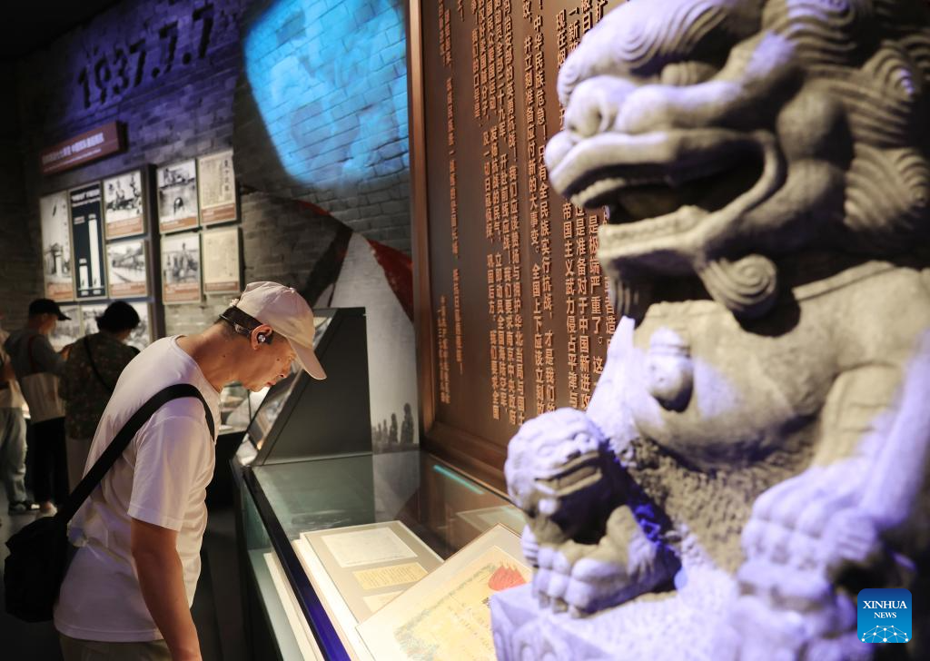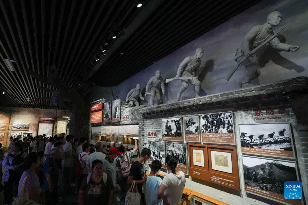 BEIJING, 8 julio, 2025 (Xinhua) -- Personas visitan una exposición con el tema "Por la liberación nacional y la paz mundial" en el Museo de la Guerra de Resistencia del Pueblo Chino contra la Agresión Japonesa, en Beijing, capital de China, el 8 de julio de 2025. La exposición para conmemorar el 80º aniversario de la victoria en la Guerra de Resistencia del Pueblo Chino contra la Agresión Japonesa y la Guerra Antifascista Mundial, se inauguró aquí el martes. La exposición cuenta con 1.525 fotografías y 3.237 artefactos en una superficie de 12.200 metros cuadrados. (Xinhua/Ju Huanzong)