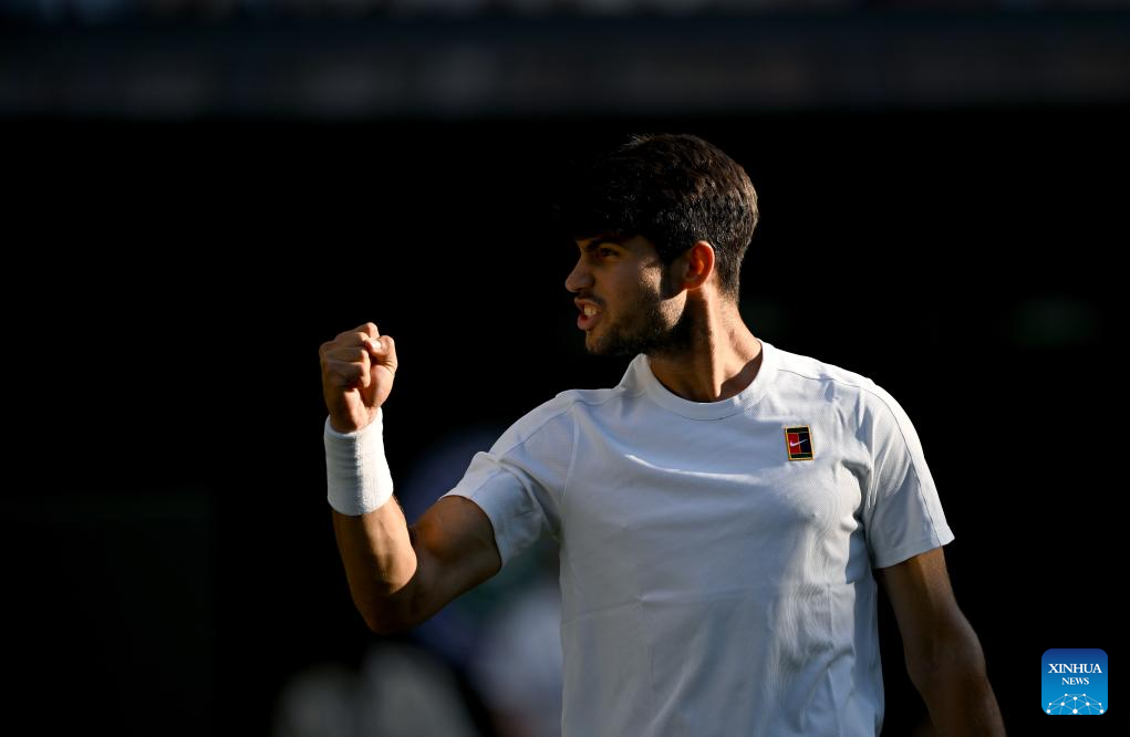 LONDRES, 9 julio, 2025 (Xinhua) -- Imagen del 8 de julio de 2025 de Carlos Alcaraz festejando al término del partido de cuartos de final de individuales masculinos entre Carlos Alcaraz, de España, y Cameron Norrie, de Reino Unido, en el Campeonato de Tenis de Wimbledon, en Londres, Reino Unido. (Xinhua/Li Ying)