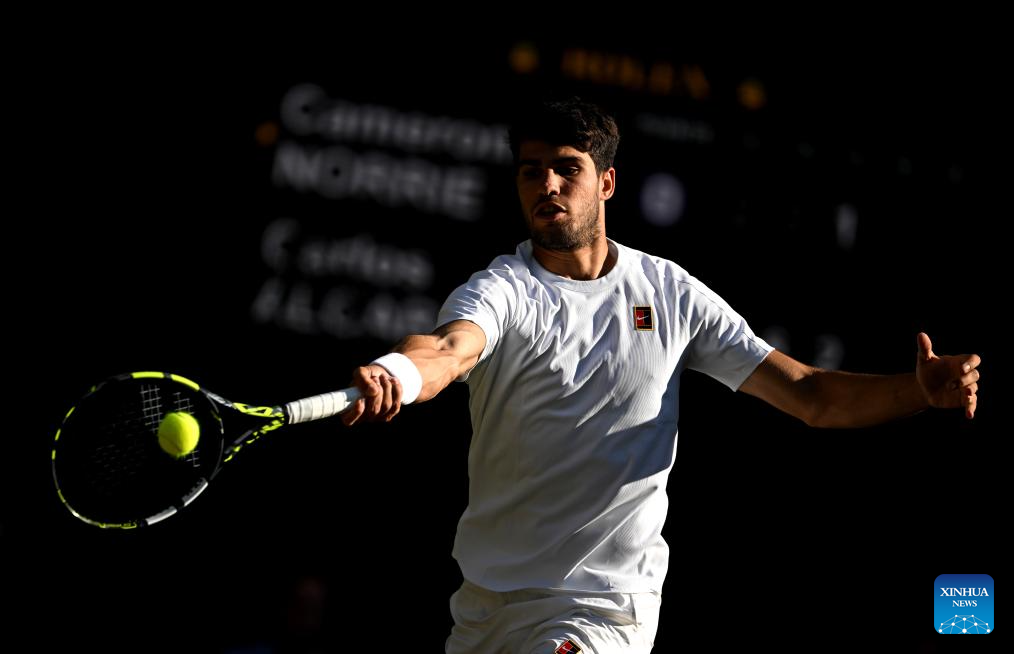 LONDRES, 9 julio, 2025 (Xinhua) -- Imagen del 8 de julio de 2025 de Carlos Alcaraz devolviendo la pelota durante el partido de cuartos de final de individuales masculinos entre Carlos Alcaraz, de España, y Cameron Norrie, de Reino Unido, en el Campeonato de Tenis de Wimbledon, en Londres, Reino Unido. (Xinhua/Li Ying)