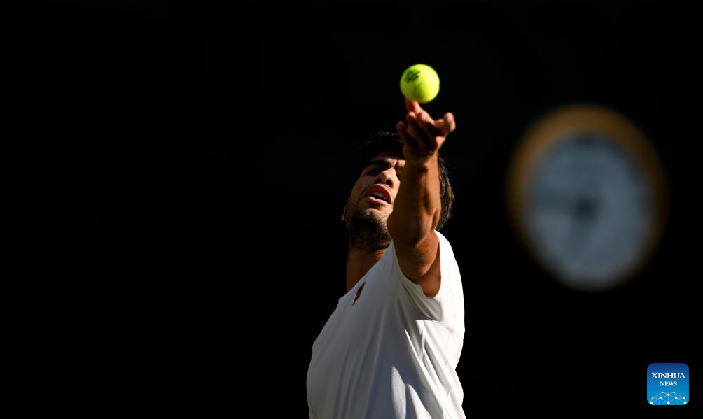LONDRES, 9 julio, 2025 (Xinhua) -- Imagen del 8 de julio de 2025 de Carlos Alcaraz sirviendo la pelota durante el partido de cuartos de final de individuales masculinos entre Carlos Alcaraz, de España, y Cameron Norrie, de Reino Unido, en el Campeonato de Tenis de Wimbledon, en Londres, Reino Unido. (Xinhua/Li Ying)