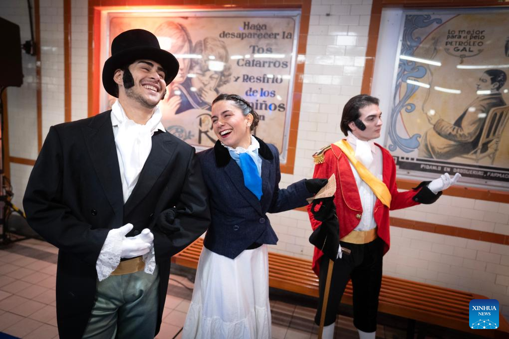 BUENOS AIRES, 9 julio, 2025 (Xinhua) -- Imagen del 8 de julio de 2025 de actores portando vestimenta de época en la estación Perú del metro de Buenos Aires durante un paseo histórico en los antiguos coches La Brugeoise, en el marco de las celebraciones por el Día de la Independencia, en la ciudad de Buenos Aires, capital de Argentina. (Xinhua/Martín Zabala)
