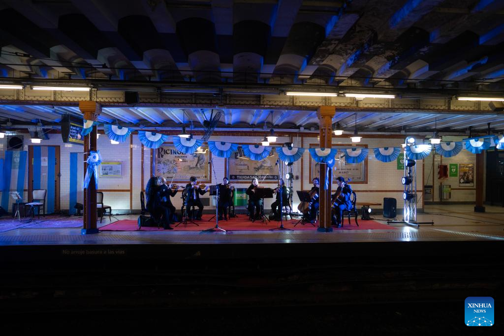 BUENOS AIRES, 9 julio, 2025 (Xinhua) -- Imagen del 8 de julio de 2025 de una orquesta interpretando el Himno Nacional Argentino en la estación Perú del metro de Buenos Aires durante un paseo histórico en los antiguos coches La Brugeoise, en el marco de las celebraciones por el Día de la Independencia, en la ciudad de Buenos Aires, capital de Argentina. (Xinhua/Martín Zabala)