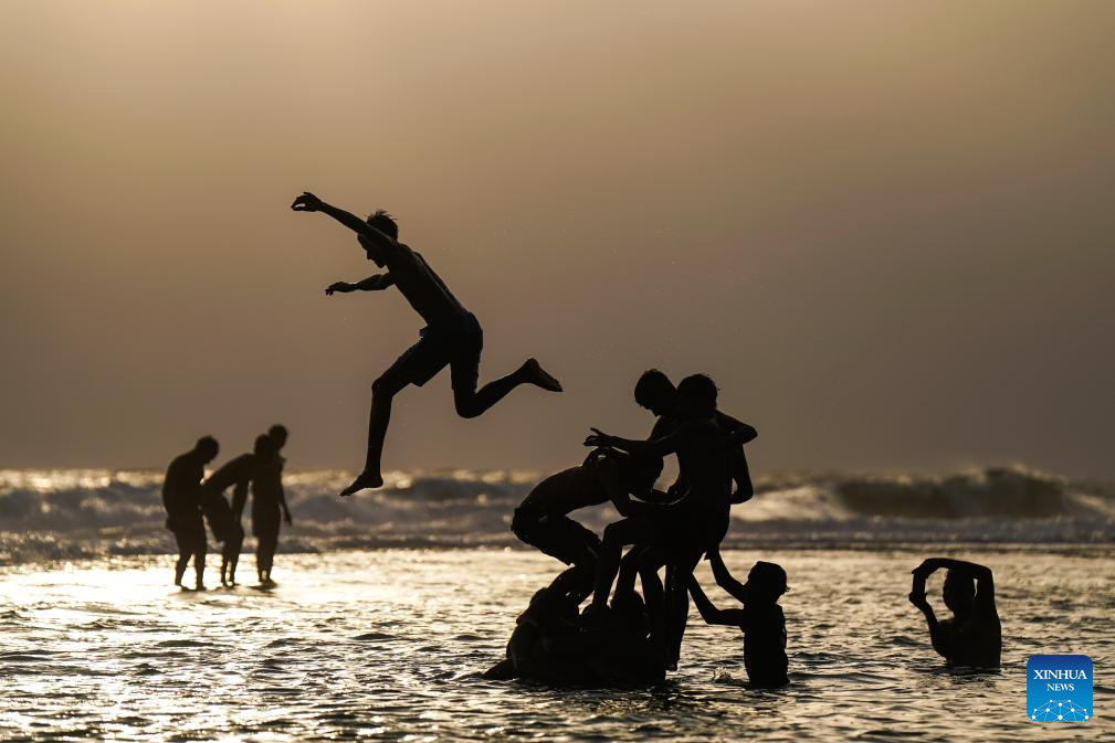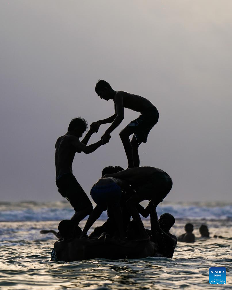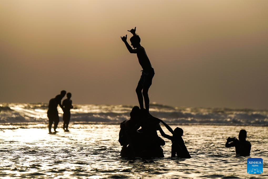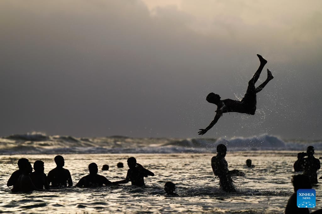 COLOMBO, 10 julio, 2025 (Xinhua) -- Imagen del 9 de julio de 2025 de personas jugando en el mar, en Galle, Sri Lanka. (Xinhua/Thilina Kaluthotage)