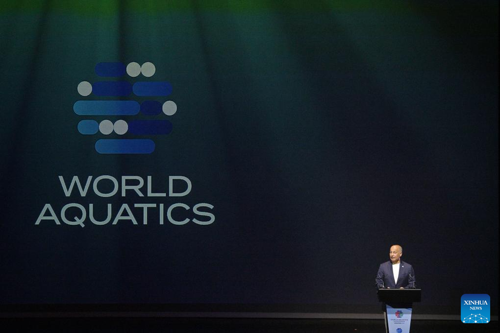 SINGAPUR, 10 julio, 2025 (Xinhua) -- El presidente de World Aquatics, Husain Al Musallam, hablando durante la ceremonia de apertura del Campeonato Mundial de Deportes Acuáticos 2025 llevado a cabo en el Singtel Waterfront Theatre, en Singapur, el 10 de julio de 2025. (Xinhua/Then Chih Wey)