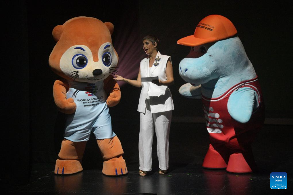 SINGAPUR, 10 julio, 2025 (Xinhua) -- Las mascotas oficiales, la nutria Ollie (i), y el dugongo Dewey (d), realizan una aparición durante la ceremonia de apertura del Campeonato Mundial de Deportes Acuáticos 2025 llevado a cabo en el Singtel Waterfront Theatre, en Singapur, el 10 de julio de 2025. (Xinhua/Then Chih Wey)