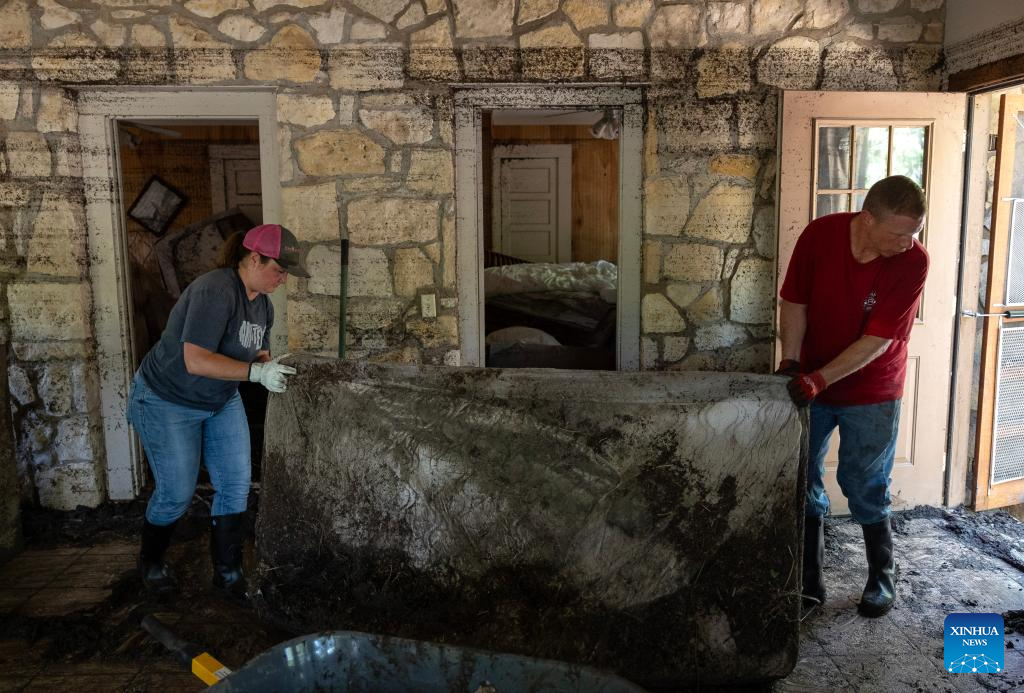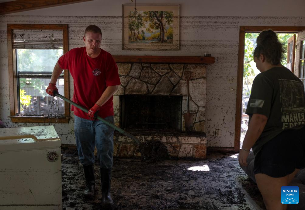 HOUSTON, 12 julio, 2025 (Xinhua) -- Imagen del 11 de julio de 2025 de personas limpiando una vivienda tras la inundación, en Hunt, Texas, Estados Unidos. Las devastadoras inundaciones del 4 de julio en el centro de Texas han cobrado al menos 121 muertos y más de 150 desaparecidos. (Xinhua/Nick Wagner)