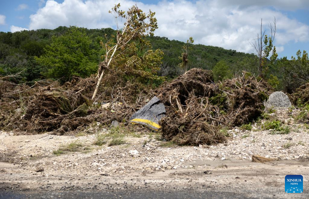 HOUSTON, 12 julio, 2025 (Xinhua) -- Imagen del 11 de julio de 2025 de trozos de una carretera entre árboles caídos, en Hunt, Texas, Estados Unidos. El presidente de Estados Unidos, Donald Trump, visitó el centro de Texas el viernes, respondiendo una vez más a las críticas a su política y a la respuesta federal a las graves inundaciones del 4 de julio, que dejaron al menos 121 muertos y más de 150 desaparecidos. (Xinhua/Nick Wagner)