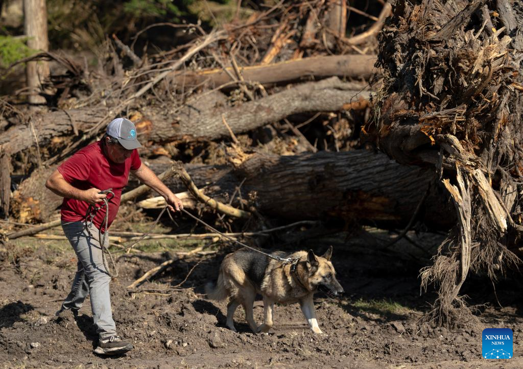 HOUSTON, 12 julio, 2025 (Xinhua) -- Imagen del 11 de julio de 2025 de un hombre y un perro detector de cadáveres buscando víctimas, en Hunt, Texas, Estados Unidos. Las devastadoras inundaciones del 4 de julio en el centro de Texas han cobrado al menos 121 muertos y más de 150 desaparecidos. (Xinhua/Nick Wagner)