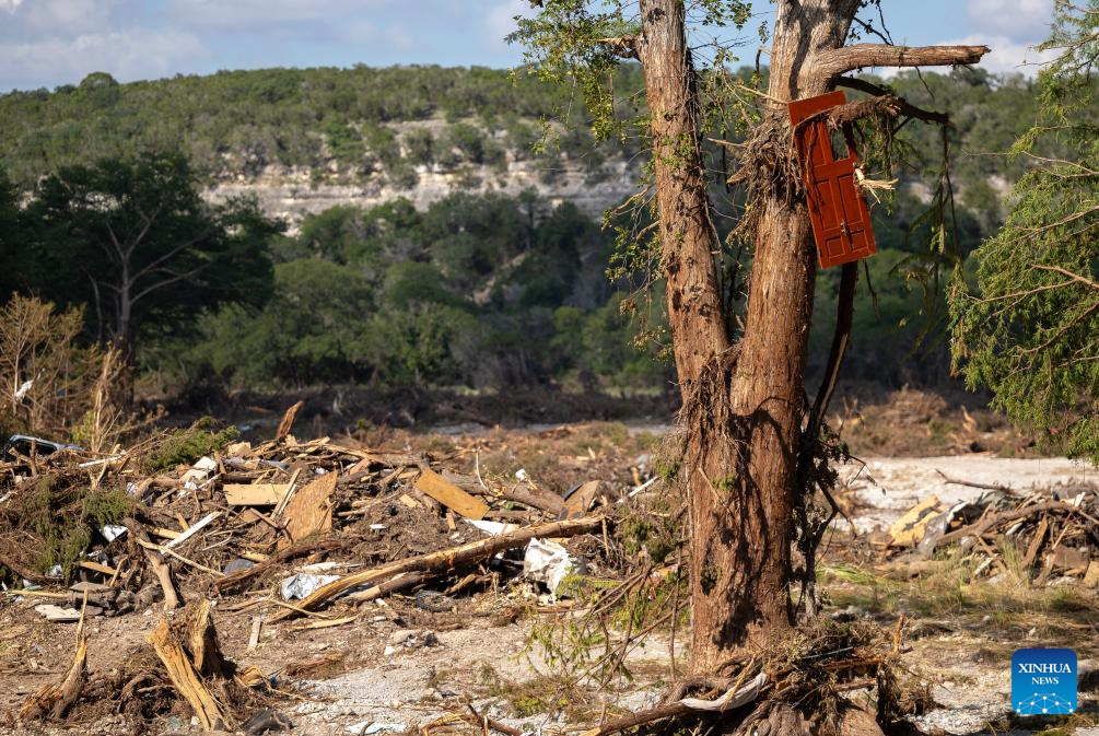 HOUSTON, 12 julio, 2025 (Xinhua) -- Imagen del 11 de julio de 2025 de una puerta atorada en un árbol después de la inundación repentina, en Hunt, Texas, Estados Unidos. Las devastadoras inundaciones del 4 de julio en el centro de Texas han cobrado al menos 121 muertos y más de 150 desaparecidos. (Xinhua/Nick Wagner)