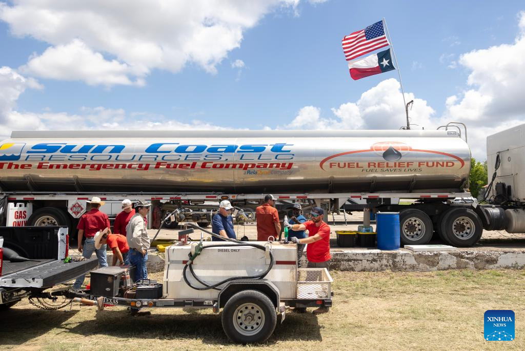 HOUSTON, 12 julio, 2025 (Xinhua) -- Imagen del 11 de julio de 2025 de voluntarios cargando combustible en un remolque cisterna para abastecer los equipos utilizados en la limpieza de las secuelas de las inundaciones, en Ingram, Texas, Estados Unidos. El presidente de Estados Unidos, Donald Trump, visitó el centro de Texas el viernes, respondiendo una vez más a las críticas a su política y a la respuesta federal a las graves inundaciones del 4 de julio, que dejaron al menos 121 muertos y más de 150 desaparecidos. (Xinhua/Nick Wagner)