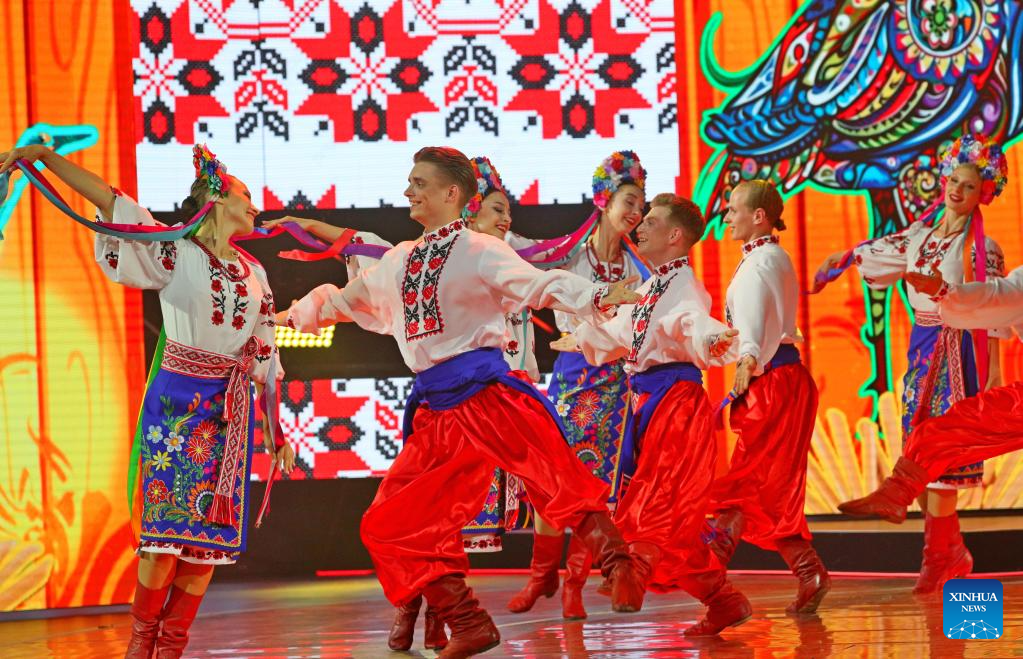 VITEBSK, 11 julio, 2025 (Xinhua) -- Imagen del 10 de julio de 2025 de artistas presentándose durante el 34 Festival Internacional de las Artes "Slavianski Bazaar", en Vitebsk, Bielorrusia. El festival, que comenzó el jueves en Vitebsk, Bielorrusia, reúne a destacados intérpretes, artistas y grupos creativos de todo el mundo. (Xinhua/Henadz Zhinkov)