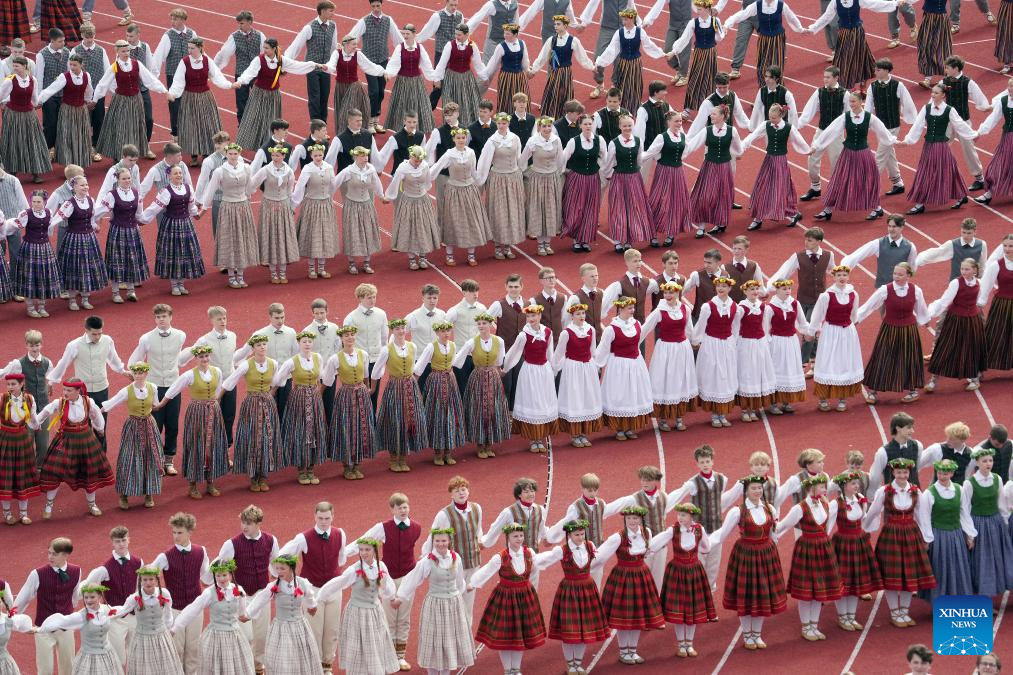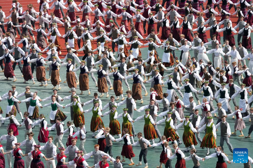 RIGA, 11 julio, 2025 (Xinhua) -- Participantes realizan una presentación durante un gran espectáculo de danza folclórica durante el 13 Festival Escolar Juvenil de Canto y Danza de Letonia, en Riga, Letonia, el 11 de julio de 2025. El festival, que se celebra cada cinco años, es uno de los mayores eventos culturales y artísticos infantiles y juveniles del país. (Xinhua/Edijs Palens)