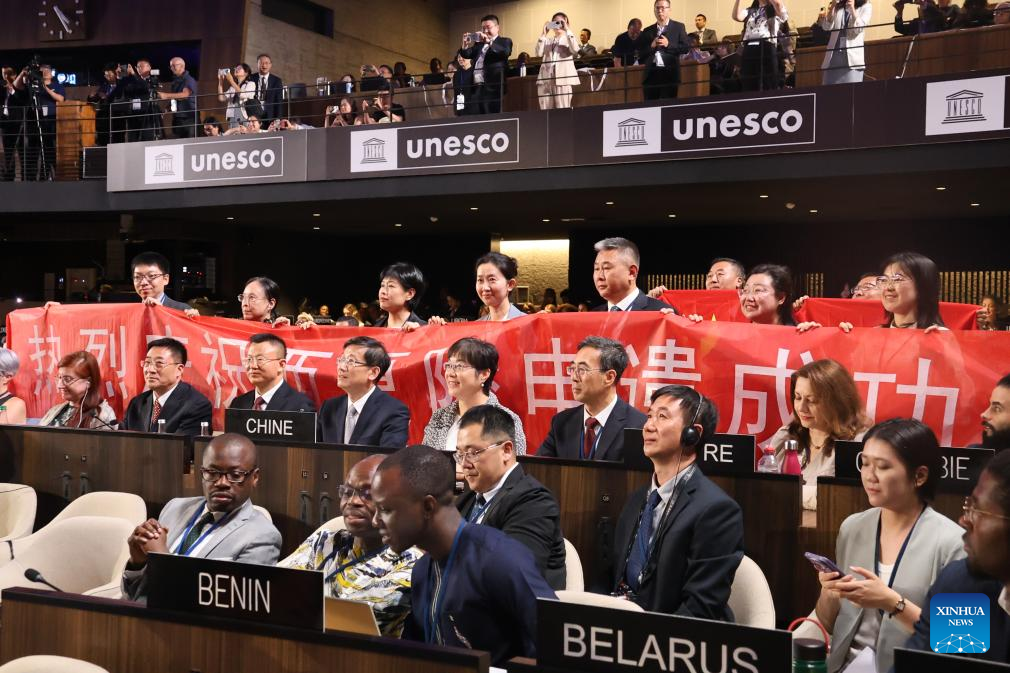 PARIS, 11 julio, 2025 (Xinhua) -- Delegados chinos festejan la inscripción de las Tumbas Imperiales de Xixia de China en la Lista del Patrimonio Mundial, en París, Francia, el 11 de julio de 2025. La inscripción eleva a 60 el número total de sitios del Patrimonio Mundial en China. (Xinhua/Zhang Baihui)