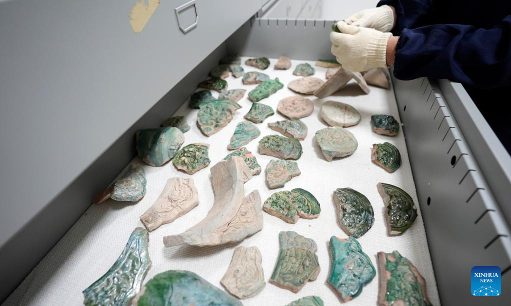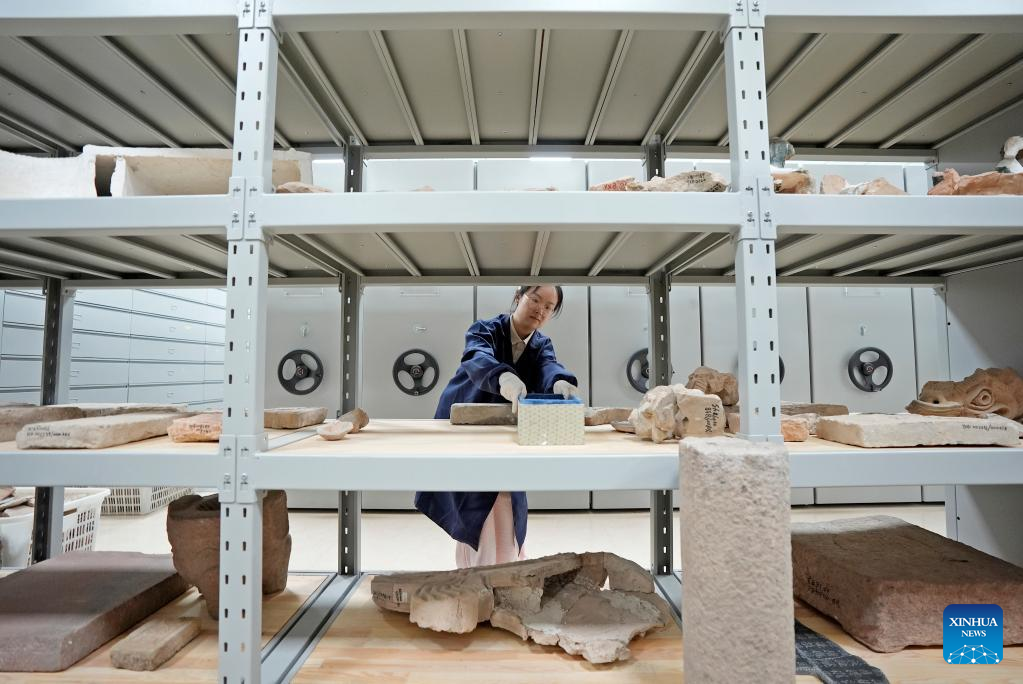YINCHUAN, 11 julio, 2025 (Xinhua) -- Imagen del 9 de julio de 2025 de un trabajador acomodando reliquias culturales en un almacén de las Tumbas Imperiales de Xixia, en Yinchuan, en la región autónoma de la etnia hui de Ningxia, en el noroeste de China. Las Tumbas Imperiales de Xixia de China fueron inscritas oficialmente en la Lista del Patrimonio Mundial de la Unesco el viernes, durante la 47ª sesión del Comité del Patrimonio Mundial, celebrada en la capital francesa, París. La inscripción eleva a 60 el número total de sitios del Patrimonio Mundial en China. (Xinhua/Yang Zhisen)