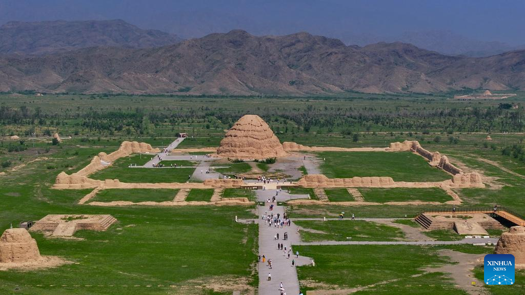 YINCHUAN, 11 julio, 2025 (Xinhua) -- Vista aérea tomada con un dron el 10 de julio de 2025 de personas visitando el área escénica de las Tumbas Imperiales de Xixia, en Yinchuan, en la región autónoma de la etnia hui de Ningxia, en el noroeste de China. Las Tumbas Imperiales de Xixia de China fueron inscritas oficialmente en la Lista del Patrimonio Mundial de la Unesco el viernes, durante la 47ª sesión del Comité del Patrimonio Mundial, celebrada en la capital francesa, París. La inscripción eleva a 60 el número total de sitios del Patrimonio Mundial en China. (Xinhua/Feng Kaihua)