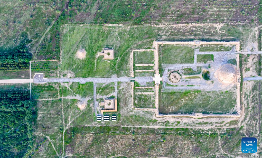 YINCHUAN, 11 julio, 2025 (Xinhua) -- Vista aérea tomada con un dron el 10 de julio de 2025 de dos tumbas imperiales de Xixia, en Yinchuan, en la región autónoma de la etnia hui de Ningxia, en el noroeste de China. Las Tumbas Imperiales de Xixia de China fueron inscritas oficialmente en la Lista del Patrimonio Mundial de la Unesco el viernes, durante la 47ª sesión del Comité del Patrimonio Mundial, celebrada en la capital francesa, París. La inscripción eleva a 60 el número total de sitios del Patrimonio Mundial en China. (Xinhua/Yang Zhisen)