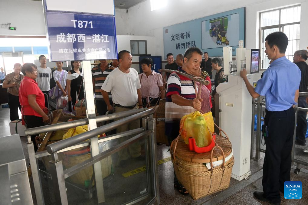 NANNING, 11 julio, 2025 (Xinhua) -- Imagen del 9 de julio de 2025 de fruticultores cargando frutas y necesidades diarias registrándose en la Estación de Hechun del Ferrocarril Litang-Zhanjiang, en la provincia de Guangdong, en el sur de China. Los trenes pintados de verde que circulan por el Ferrocarril Litang-Zhanjiang ofrecen un viaje muy rentable a los fruticultores. (Xinhua/Lu Boan)