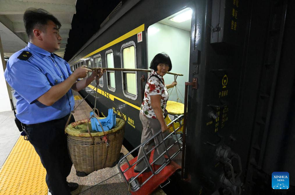 NANNING, 11 julio, 2025 (Xinhua) -- Imagen del 9 de julio de 2025 de un trabajador ferroviario (i) ayudando a una fruticultora a subir sus cestas a un tren en la Estación de Luchuan del Ferrocarril Litang-Zhanjiang, en la región autónoma de la etnia zhuang de Guangxi, en sur de China. Los trenes pintados de verde que circulan por el Ferrocarril Litang-Zhanjiang ofrecen un viaje muy rentable a los fruticultores. (Xinhua/Lu Boan)