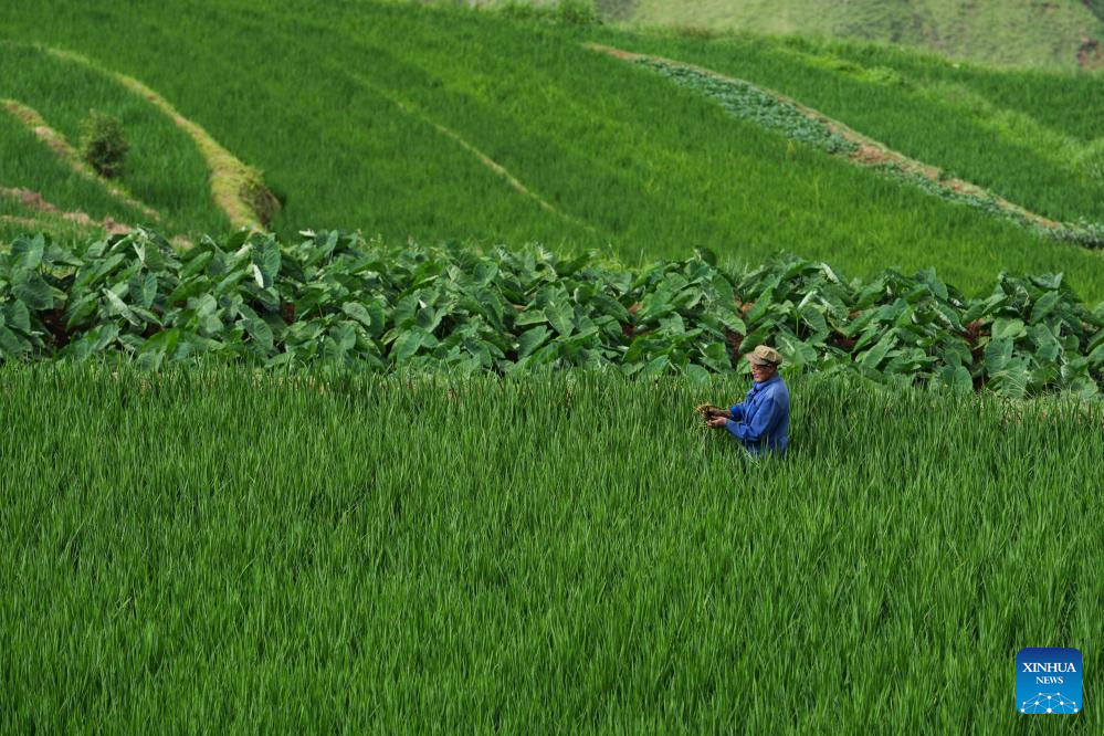 PANZHIHUA, 11 julio, 2025 (Xinhua) -- Imagen del 9 de julio de 2025 de un agricultor trabajando en un campo en terrazas, en la aldea de Xinshan del distrito de Miyi, en la ciudad de Panzhihua, en la provincia de Sichuan, en el suroeste de China. Aprovechando los abundantes recursos hídricos y el suelo fértil del valle del río Anning, Panzhihua ha desarrollado una agricultura característica en los años recientes mediante la construcción de bases agrícolas, el cultivo de parques industriales, el procesamiento de productos agrícolas y la promoción de la industria de la salud y el desarrollo de la integración. (Xinhua/Jiang Hongjing)