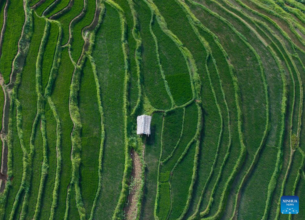 PANZHIHUA, 11 julio, 2025 (Xinhua) -- Vista aérea tomada por un dron el 9 de julio de 2025 de un campo en terrazas, en la aldea de Xinshan del distrito de Miyi, en la ciudad de Panzhihua, en la provincia de Sichuan, en el suroeste de China. Aprovechando los abundantes recursos hídricos y el suelo fértil del valle del río Anning, Panzhihua ha desarrollado una agricultura característica en los años recientes mediante la construcción de bases agrícolas, el cultivo de parques industriales, el procesamiento de productos agrícolas y la promoción de la industria de la salud y el desarrollo de la integración. (Xinhua/Jiang Hongjing)
