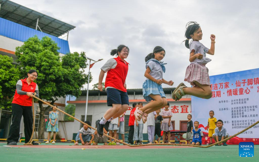BEIJING, 12 julio, 2025 (Xinhua) -- Imagen del 11 de julio de 2025 de niños saltando la cuerda junto a una voluntaria, en el distrito de Daoxian, en la ciudad de Yongzhou de la provincia de Hunan, en el centro de China. Los niños de todo el país están enriqueciendo sus vacaciones de verano a través de actividades coloridas. (Xinhua/Jiang Keqing)