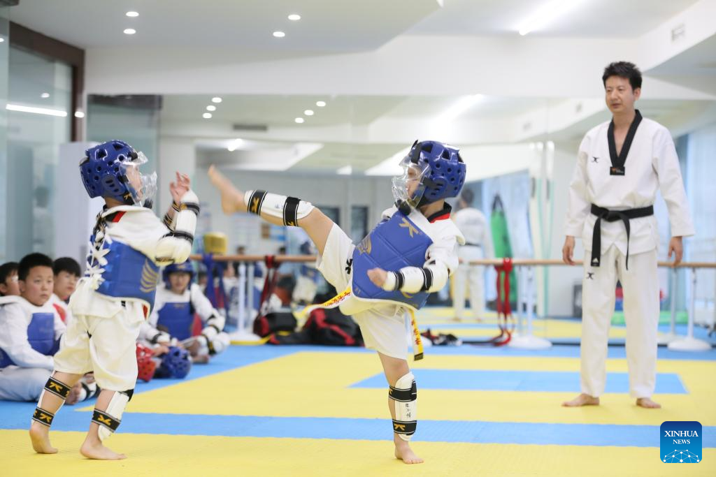 BEIJING, 12 julio, 2025 (Xinhua) -- Imagen del 10 de julio de 2025 de niños practicando taekwondo, en el distrito de Shizhong de Leshan, en la provincia de Sichuan, en el suroeste de China. Los niños de todo el país están enriqueciendo sus vacaciones de verano a través de actividades coloridas. (Xinhua/Li Huashi)