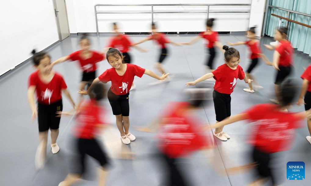 BEIJING, 12 julio, 2025 (Xinhua) -- Niños practican danza en una clase de entrenamiento, en el distrito de Tancheng, en la ciudad de Linyi de la provincia de Shandong, en el este de China, el 12 de julio de 2025. Los niños de todo el país están enriqueciendo sus vacaciones de verano a través de actividades coloridas. (Xinhua/Zhang Chunlei)