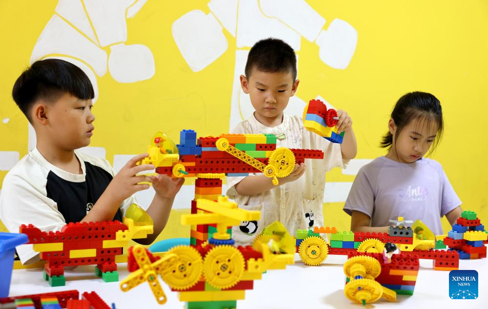 BEIJING, 12 julio, 2025 (Xinhua) -- Niños juegan con bloques de juguete, en Zaozhuang, en la provincia de Shandong, en el este de China, el 12 de julio de 2025. Los niños de todo el país están enriqueciendo sus vacaciones de verano a través de actividades coloridas. (Xinhua/Sun Zhongzhe)