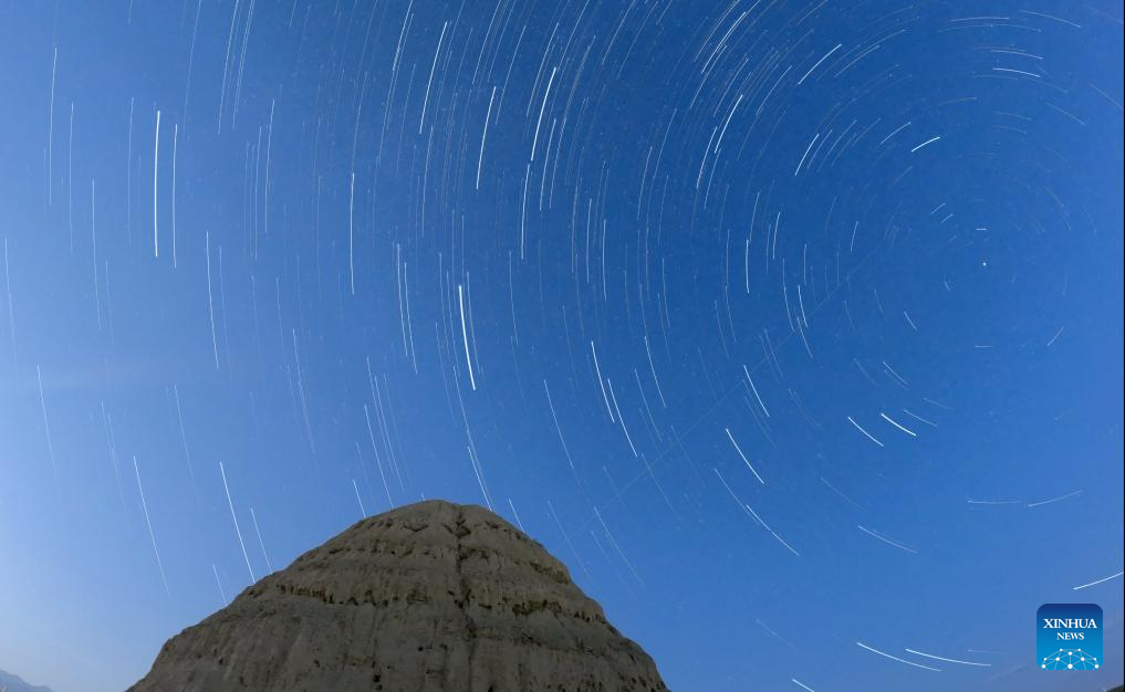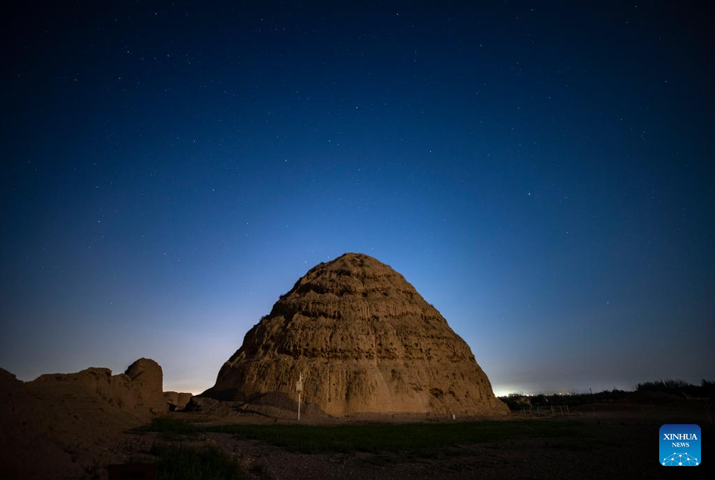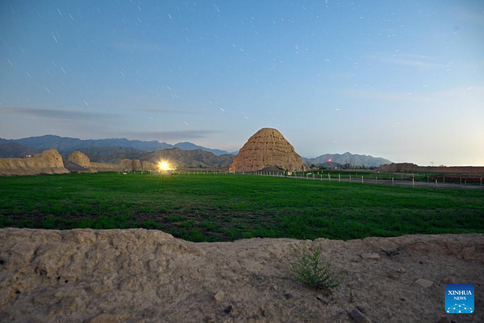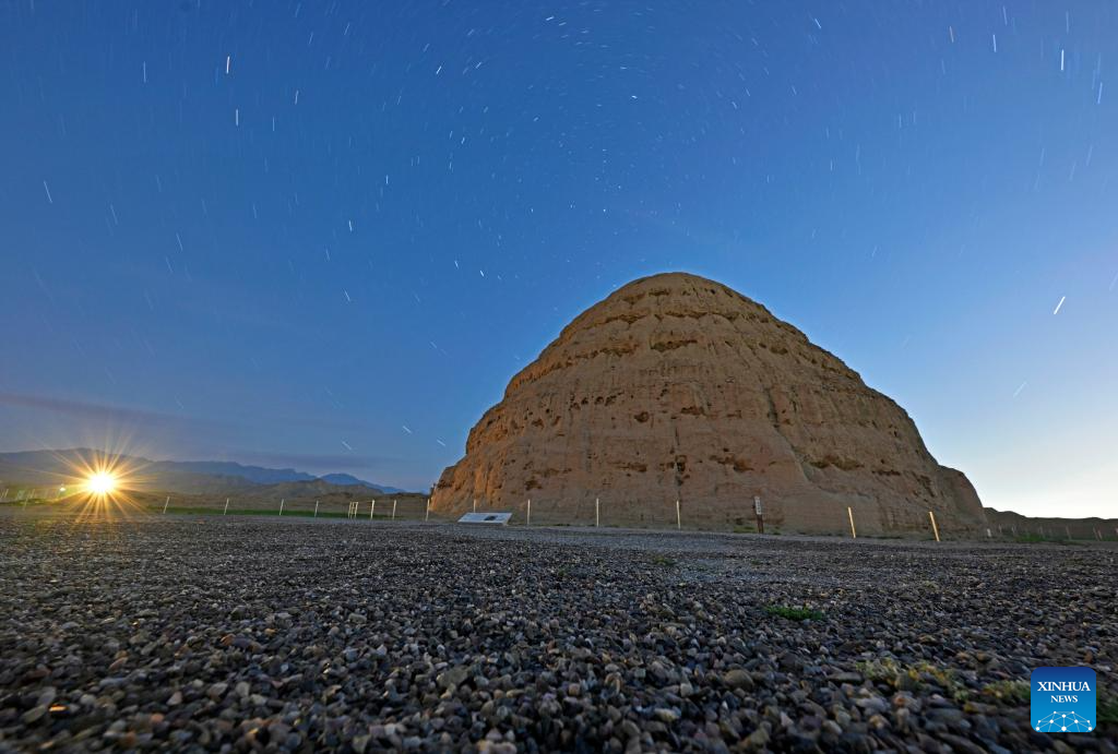 YINCHUAN, 12 julio, 2025 (Xinhua) -- Imagen del 10 de julio de 2025 de una tumba imperial de Xixia bajo las estrellas, en Yinchuan, en la región autónoma hui de Ningxia, en el noroeste de China. Las Tumbas Imperiales de Xixia de China fueron inscritas oficialmente en la Lista del Patrimonio Mundial de la Unesco el viernes, durante la 47ª sesión del Comité del Patrimonio Mundial, celebrada en la capital francesa, París. La inscripción eleva a 60 el número total de sitios del Patrimonio Mundial en China. (Xinhua/Yang Zhisen)